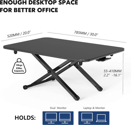 Consistency matters: brief position changes every 30–60 minutes can help maintain alertness, support joint comfort, and make it easier to meet movement goals outside work hours. The generous 30" x 20" surface supports common setups—single or dual monitors, or a laptop plus monitor—so you can maintain neutral viewing angles and wrist positions that favor long-term comfort. The 2.2"–16.1" height range allows more users to dial in ergonomics that fit their body and task, whether typing, reading, or video calls. By removing friction to move more often, this tool helps turn a healthy habit—breaking up sitting—into a sustainable part of your routine.