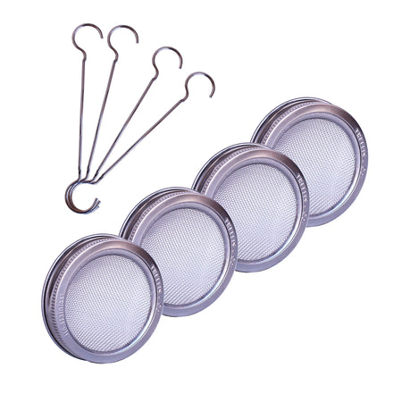 Convert wide-mouth mason jars into reliable countertop sprouters. This 4-pack features 316 stainless steel lids and rings with a curved, double-thick mesh for excellent airflow and drainage, while keeping even small sprouting seeds inside. Components are corrosion-resistant and dishwasher safe, and the included drain stands help position jars for optimal drying between rinses.