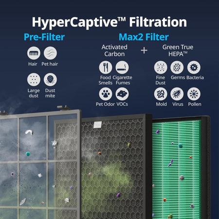 - Three-stage system: washable pre-filter, activated carbon filter, and True HEPA filter.