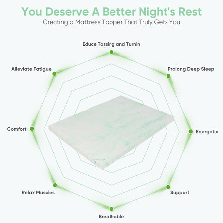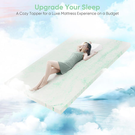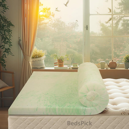 Upgrade a dorm or guest bed with a plush, breathable layer. This Twin XL 2-inch gel-infused memory foam topper features a ventilated design for airflow and a light green tea infusion for a fresher scent—adding pressure relief and comfort to an overly firm mattress without a full replacement.