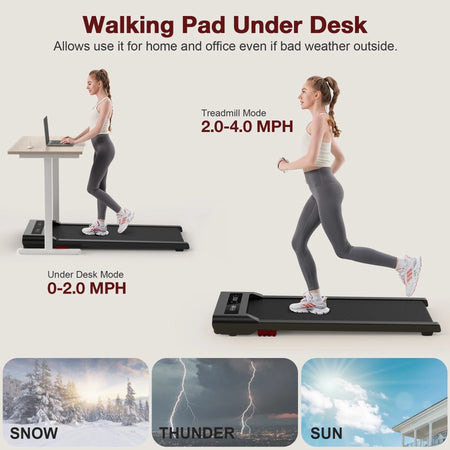 - Versatile use: Under-desk walking/working mode (0.6–2.0 mph) and brisk-walk/jog mode (2.0–4.0 mph) to match your pace.