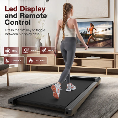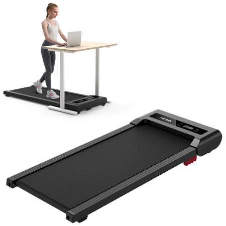 Stay active while you work with a compact under-desk walking pad designed for daily use. A quiet 2.5HP motor (<45 dB) delivers a smooth 0.6–4.0 mph speed range, supporting users up to 300 lb. The built-in LED display tracks speed, steps, time, distance, and calories, and the included remote makes adjustments simple. It arrives fully assembled and stores easily thanks to its slim profile and transport wheels.